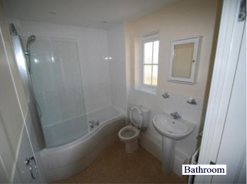 Pedestal wash hand basin. Mirrored cabinet. Low level WC. Shaped panelled bath with side mixer taps and separately plumbed shower unit over, shower screen. Local tiling. Smooth magnolia walls and white gloss-work. Double radiator. Shaver point. Frosted PVC double glazed window to rear.