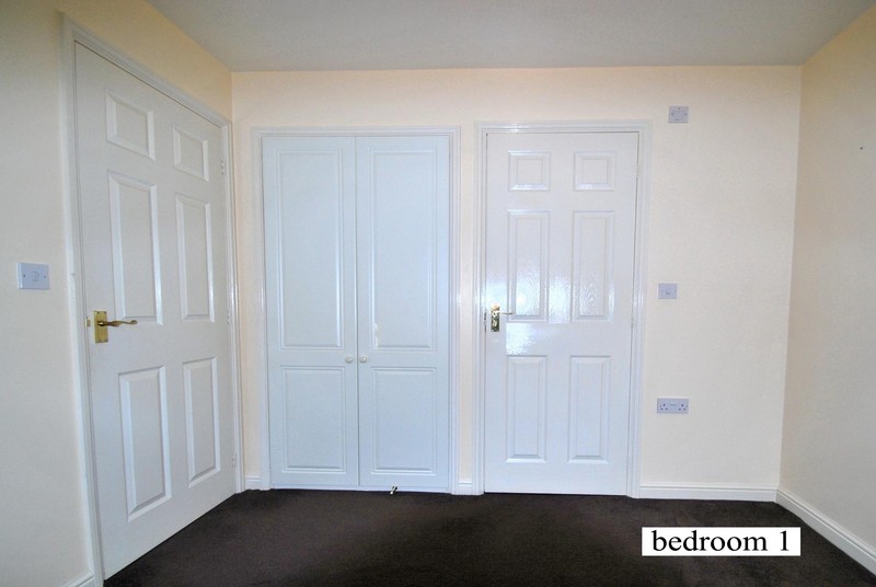 The features of double size master bedroom are, beige carpet, smooth magnolia walls, white gloss-work, radiator, and PVC double-glazing window attired with a wooden blind facing to the front of the house.
