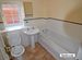 The upstairs family bathroom boasts an impressive white matching suite, complimenting white tiled splash-back to sink & bath area, cabinet, smooth magnolia walls, beige laminate flooring and frosted PVC double-glazing window.